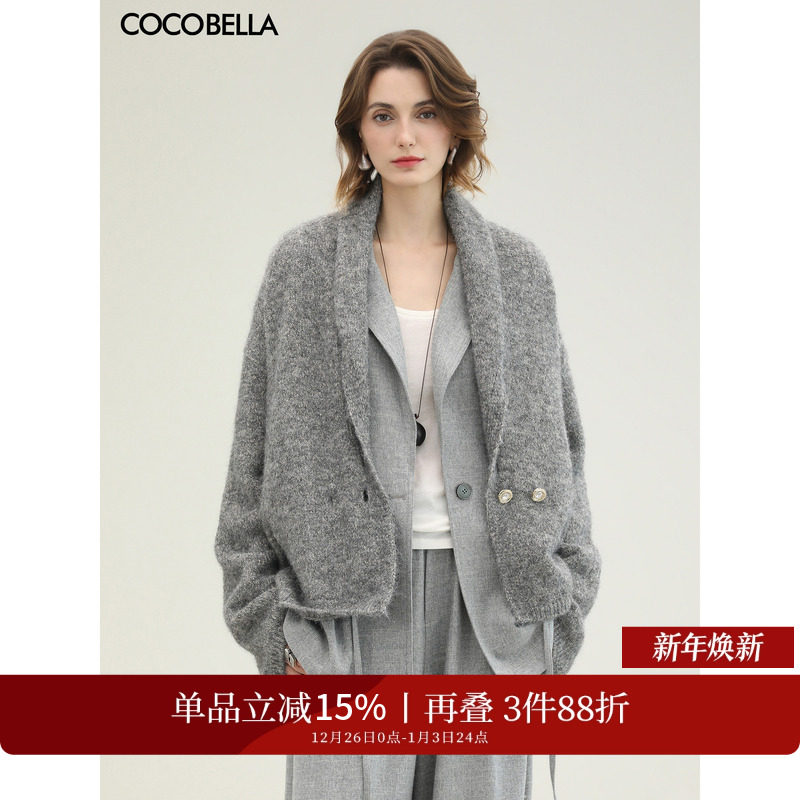 COCOBELLA花纱毛衣女秋冬灰色上衣休闲长绒针织衫外套MZ3218