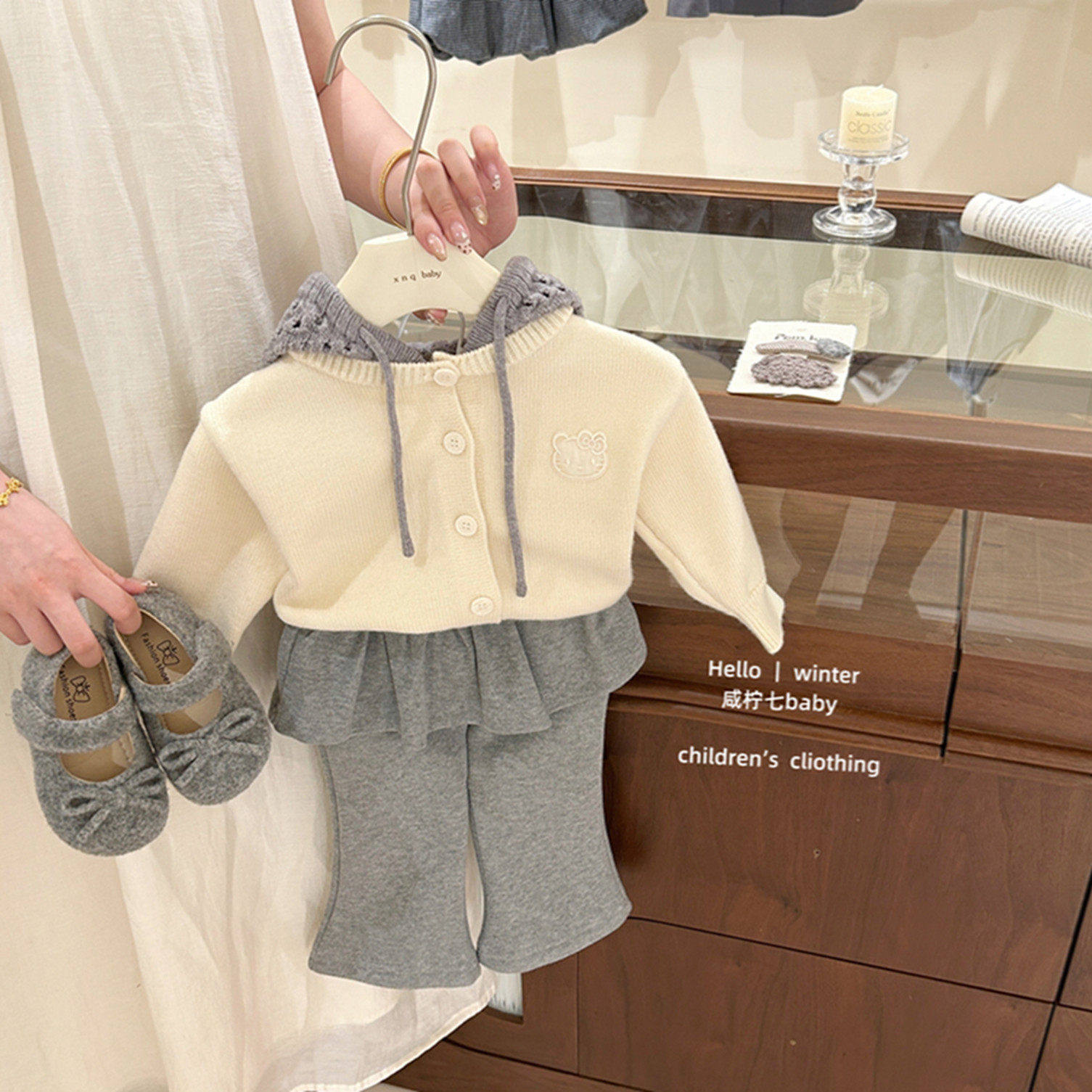【咸柠七】原创!女童秋冬韩系连帽kt毛衣开衫加绒屁帘长裤两件套