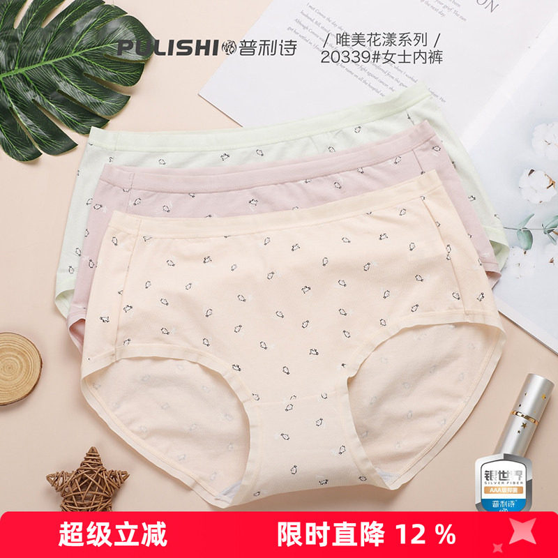 一盒2条 普利诗内裤女士莫尔代棉印花中腰三角短裤抗菌底裆20339