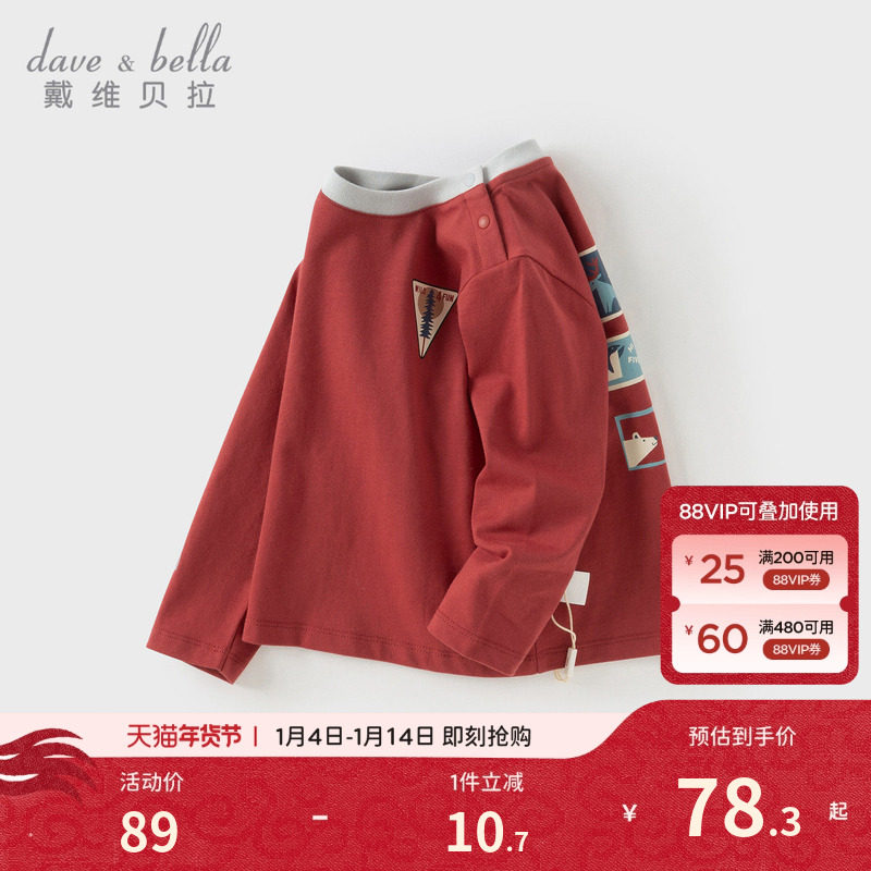 戴维贝拉儿童长袖T恤2026秋装新款男童新年红色打底宝宝纯棉上衣
