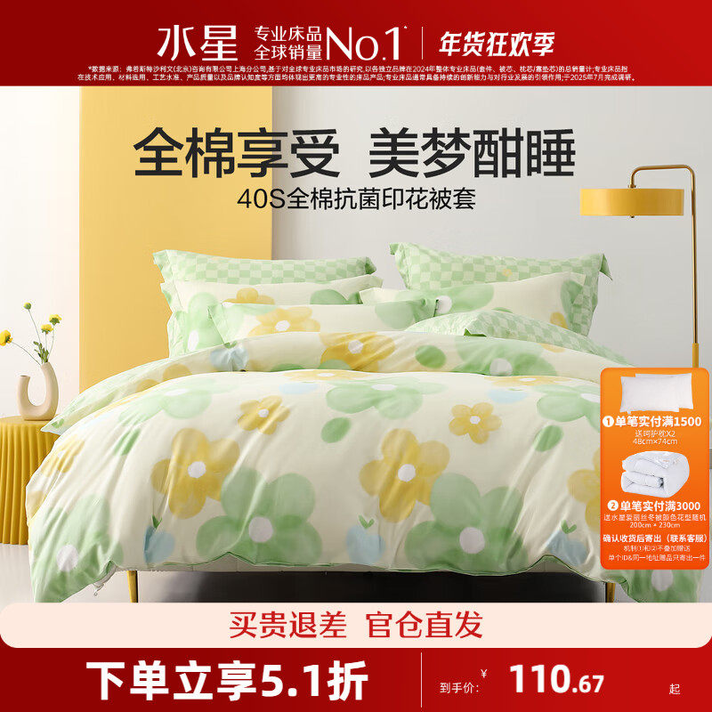 水星家纺全棉被套印花单件抗菌被罩春秋季学生宿舍单人被子套床品