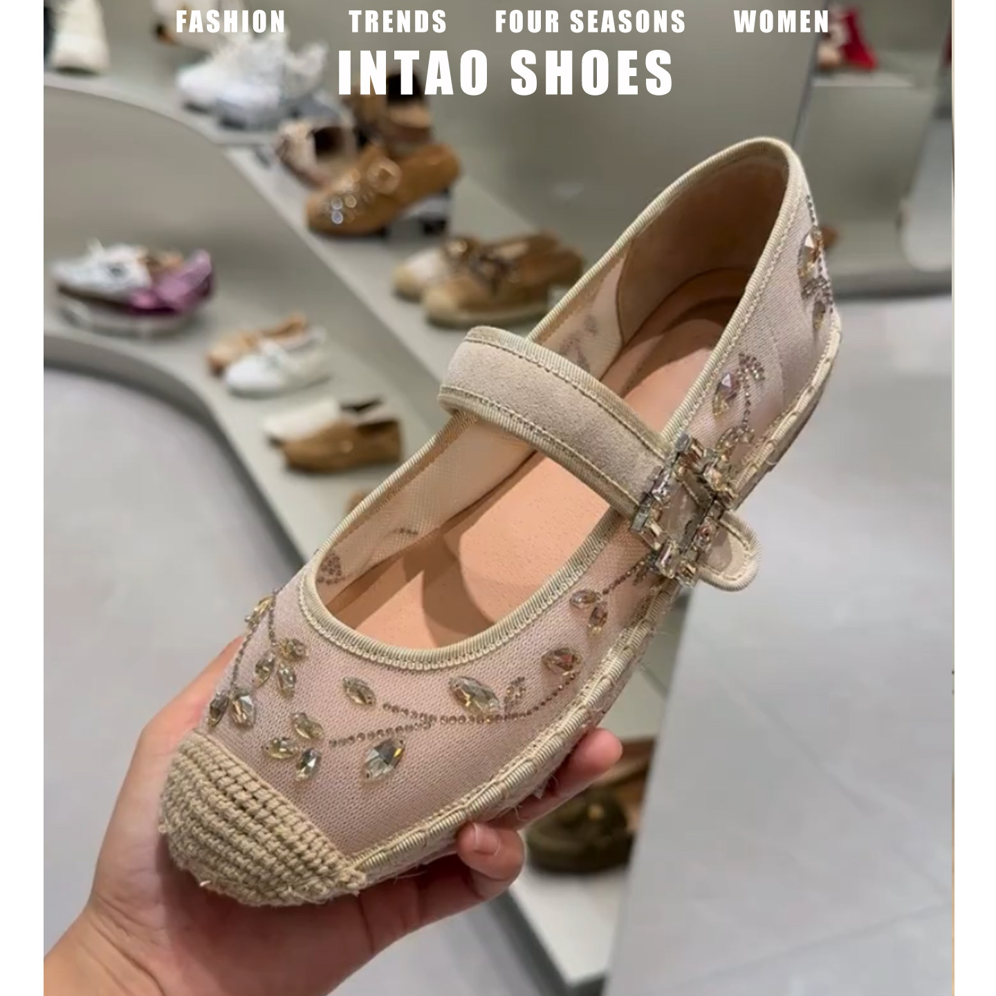 高级感网纱透气面草编渔夫鞋女2026新款水钻一字带圆头玛丽珍单鞋