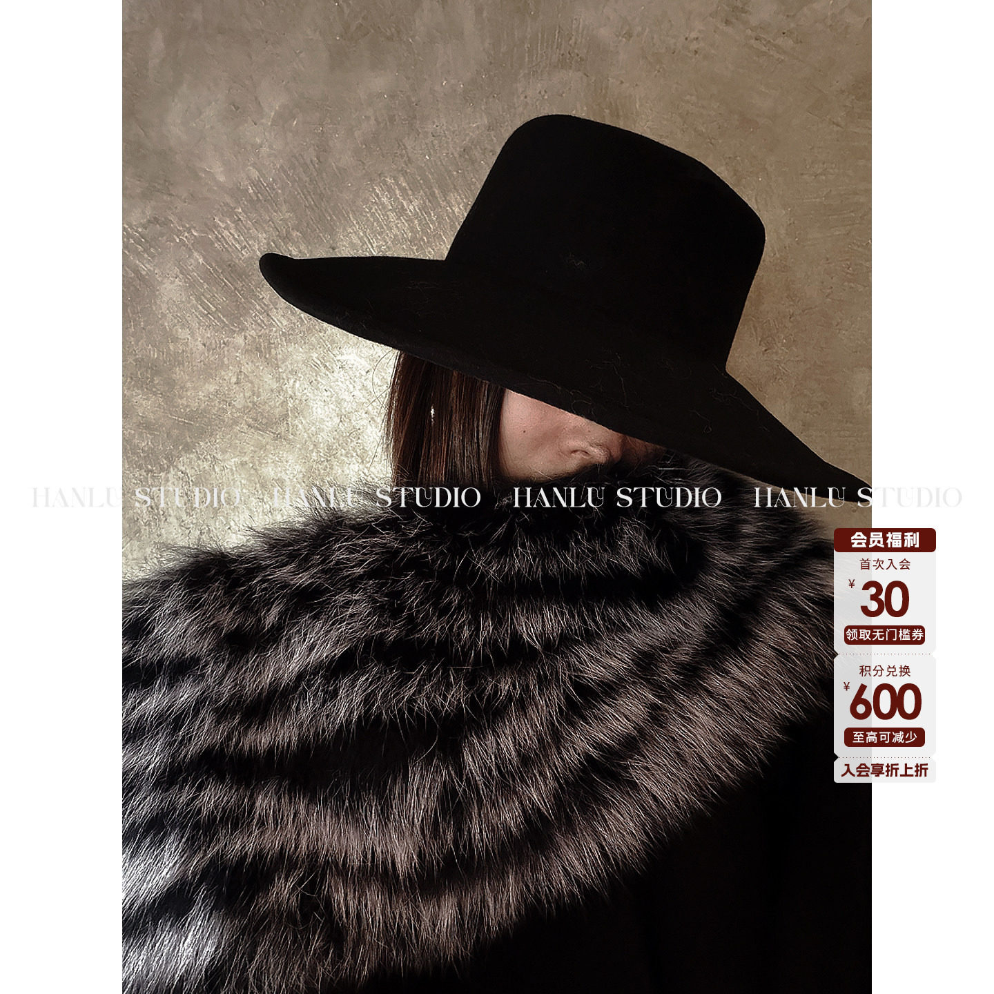 HANLU STUDIO狐狸毛领围巾100绵羊毛双面呢拼接真毛领花黑色披肩