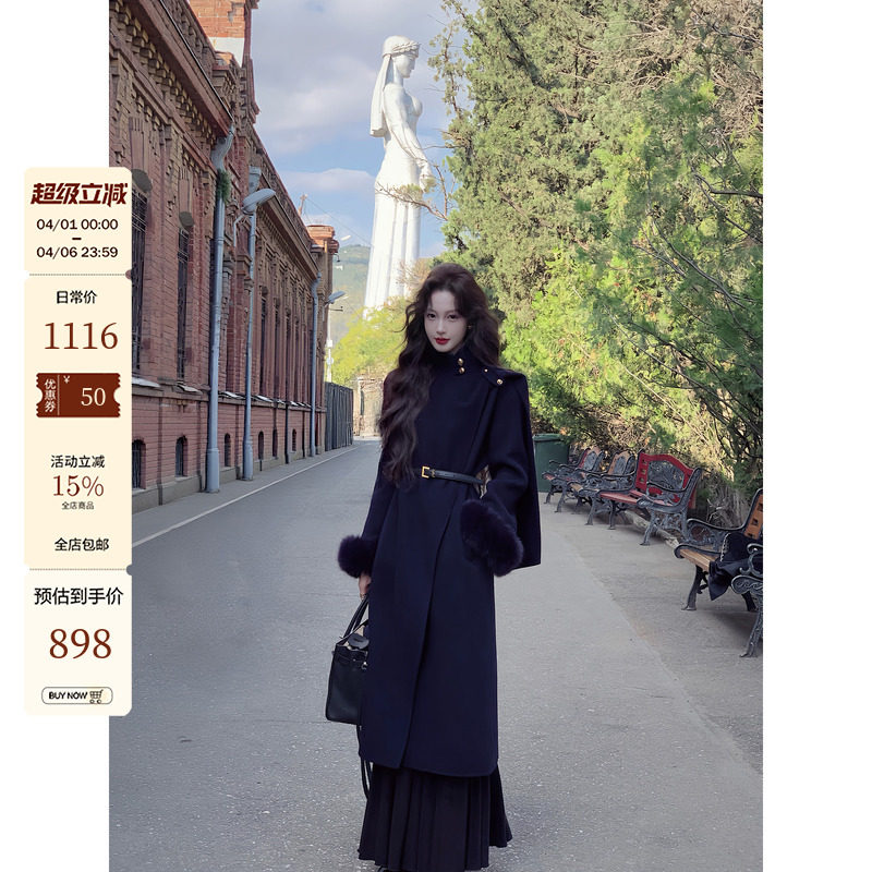 吃绿色菜【塔芙小姐】50元券】100羊毛藏蓝立领披肩双面呢大衣