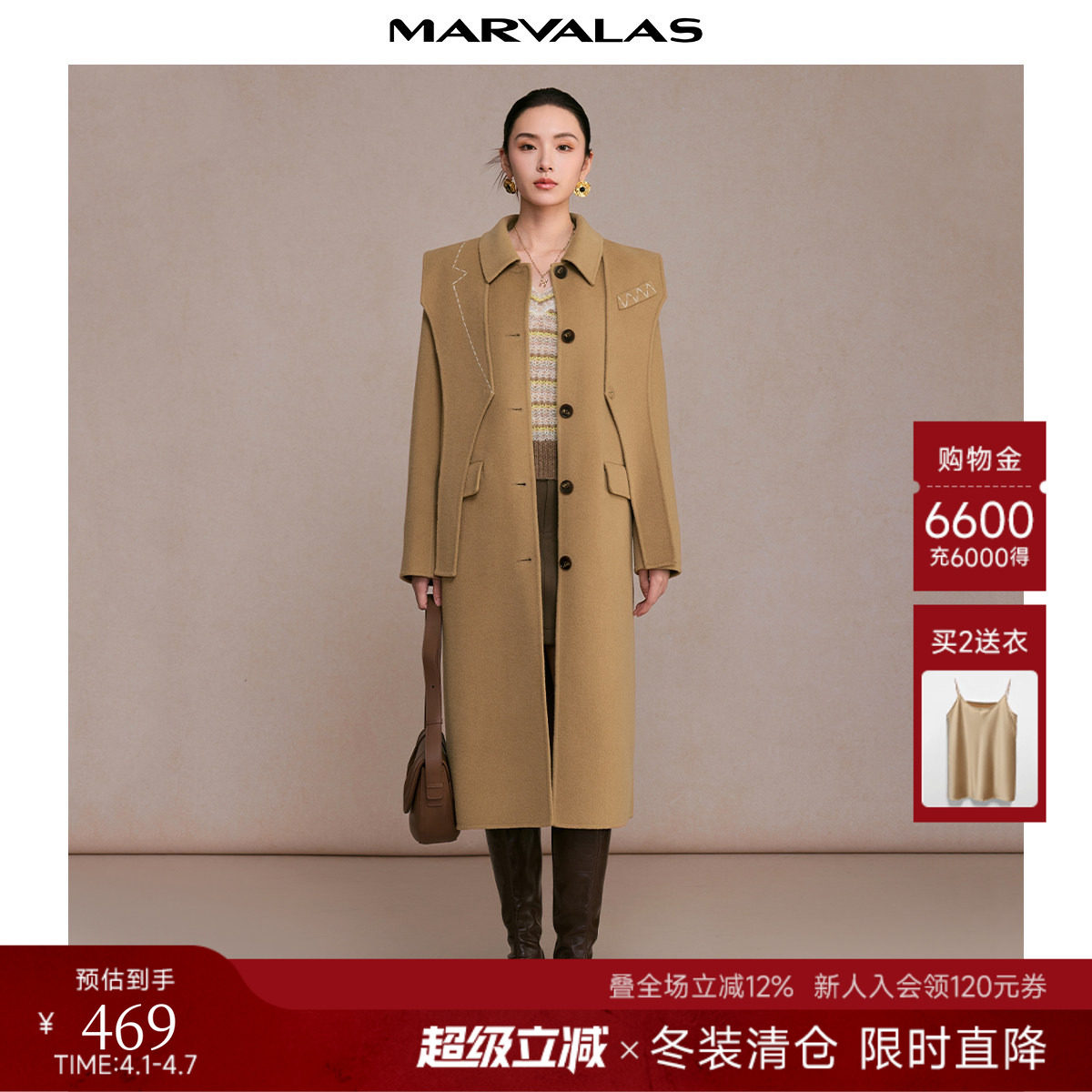 曼德诗长款毛呢外套2024冬季新款100%绵羊毛设计感披肩双面呢大衣