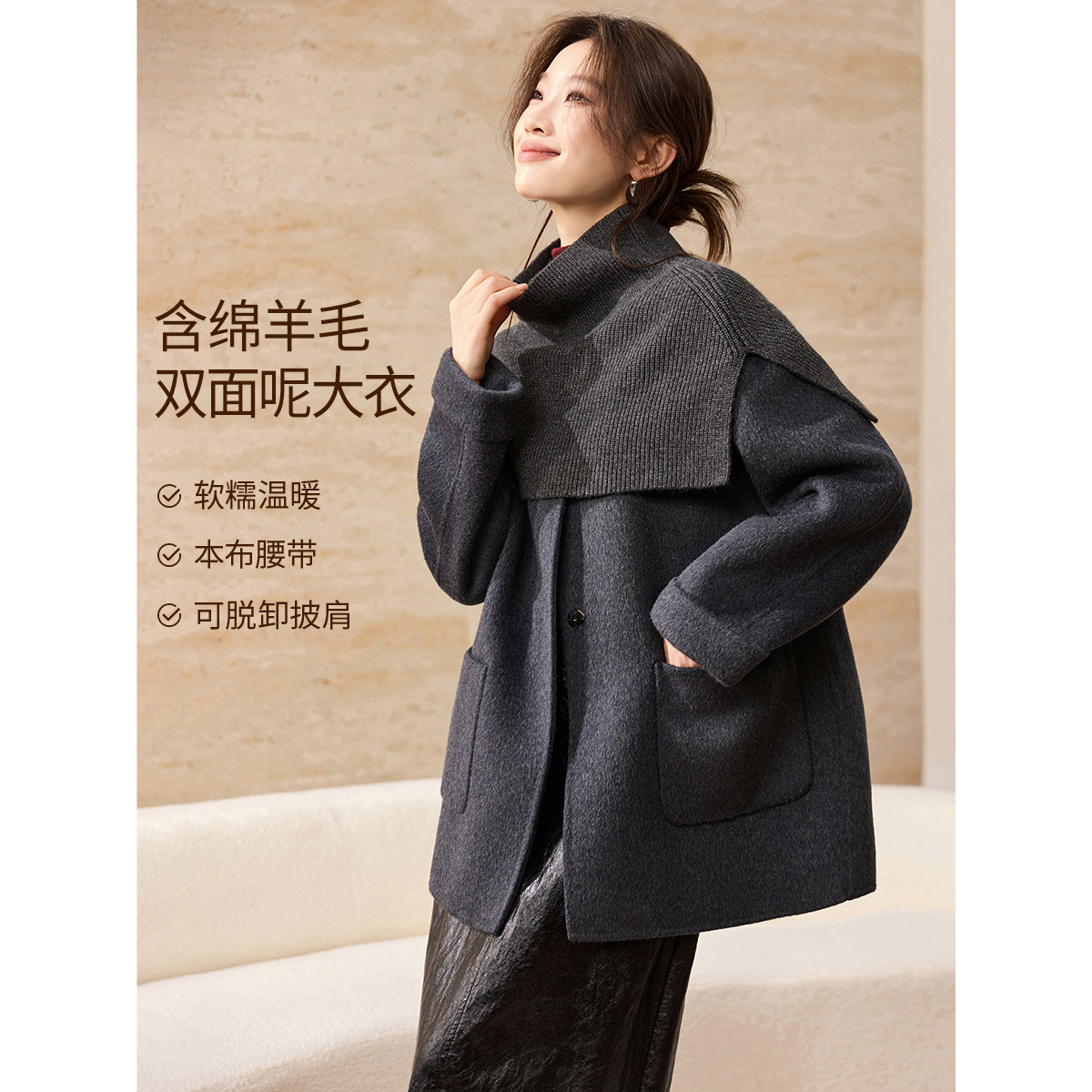 混深灰牦牛绒围巾披肩双面羊毛大衣女短款新款宽松高级感毛呢外套
