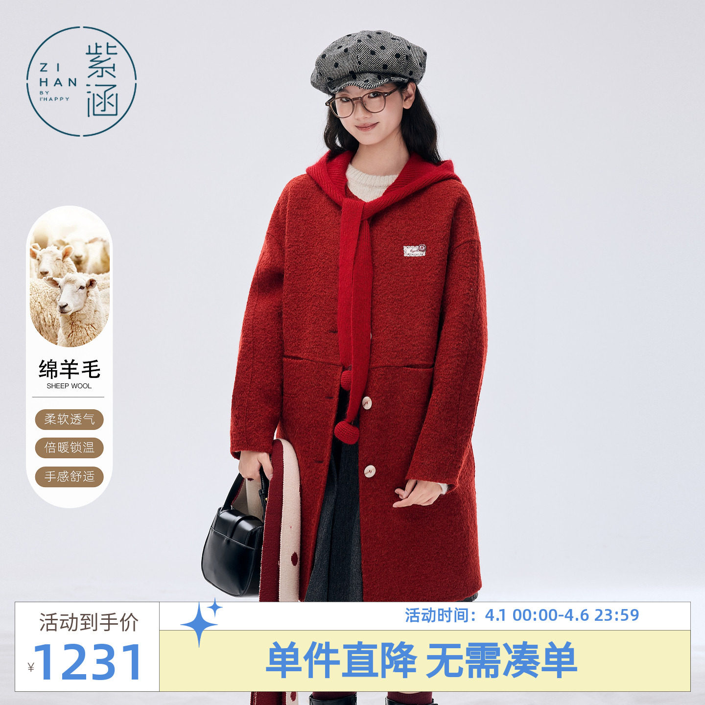 紫涵中长款羊毛呢外套女2025年冬季新款针织披肩帽红色双面呢大衣