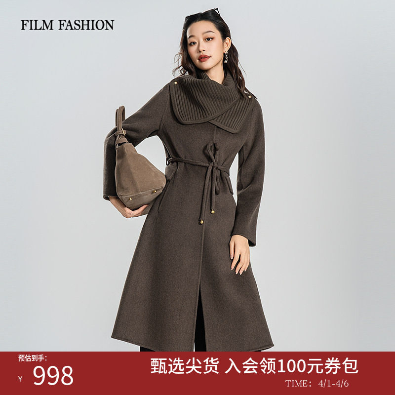 吃绿色菜【檀香木】时髦大披肩长款羊毛双面呢大衣咖色冬季女外套