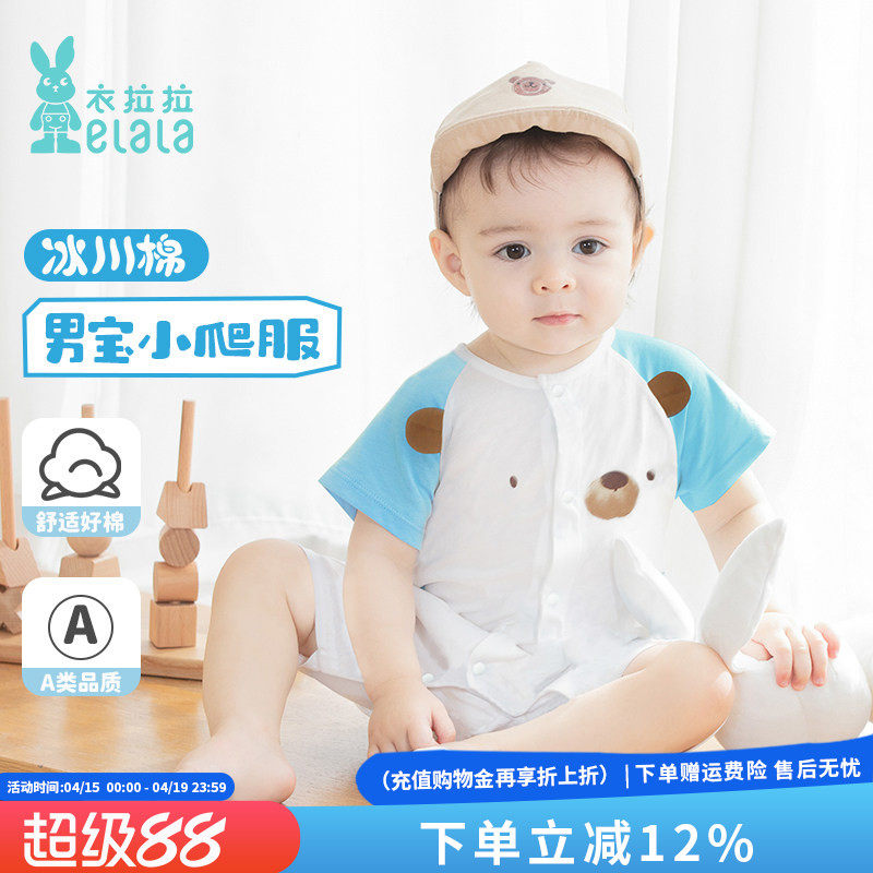 衣拉拉夏季婴儿连体衣短袖纯棉薄款0-1岁男童哈衣冰川棉宝宝爬服