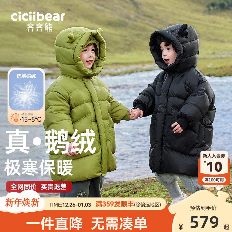 [鹅绒服三防蓄热]齐齐熊男女童羽绒服中长款宝宝冬季儿童加厚外套