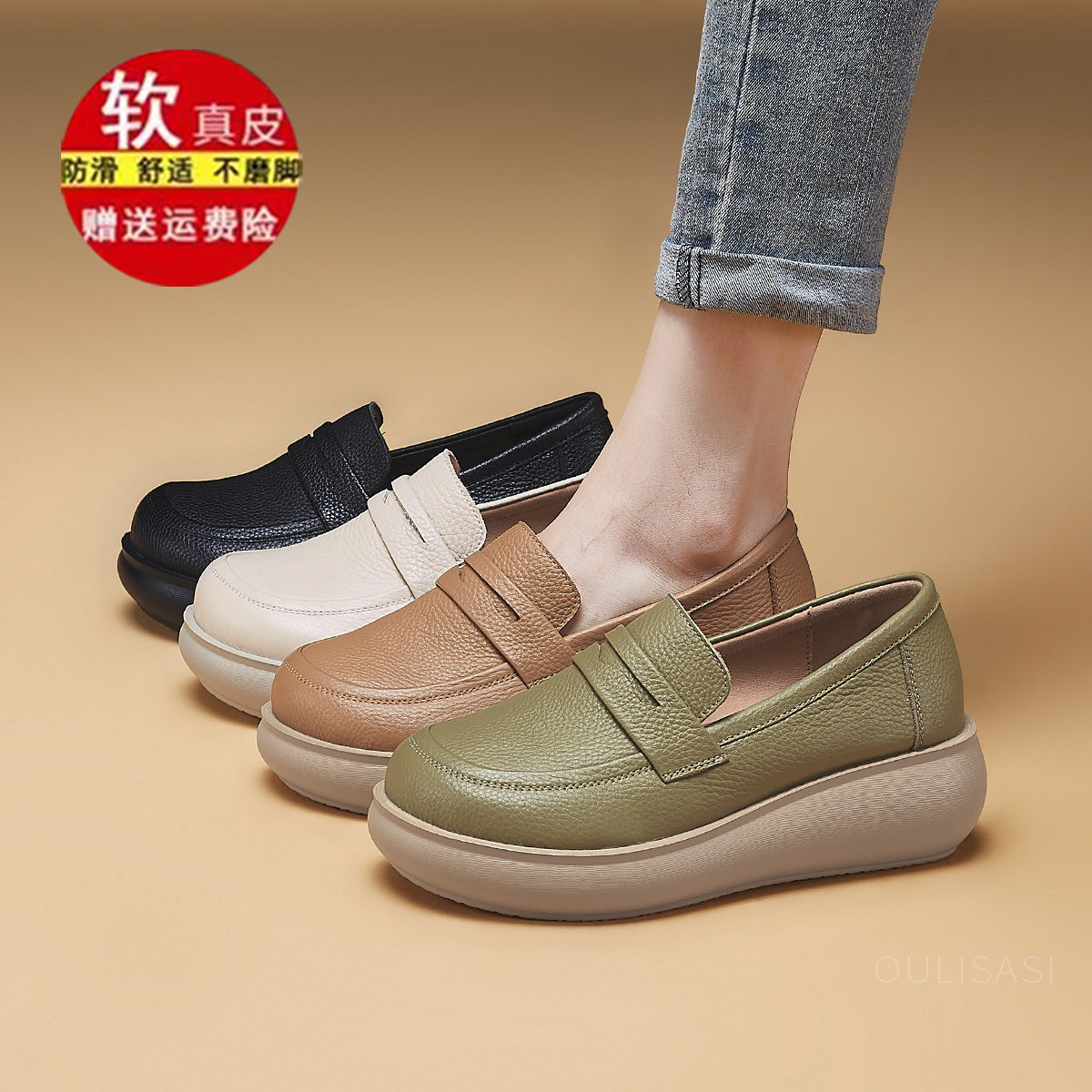 真皮牛皮浅口圆头单鞋女中跟坡跟简约工作鞋妈妈鞋一脚蹬休闲女鞋