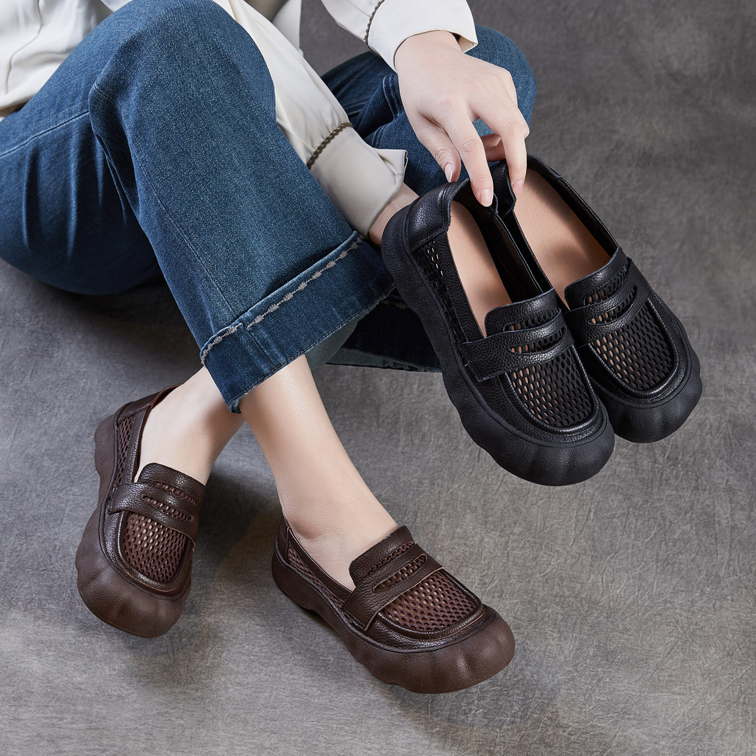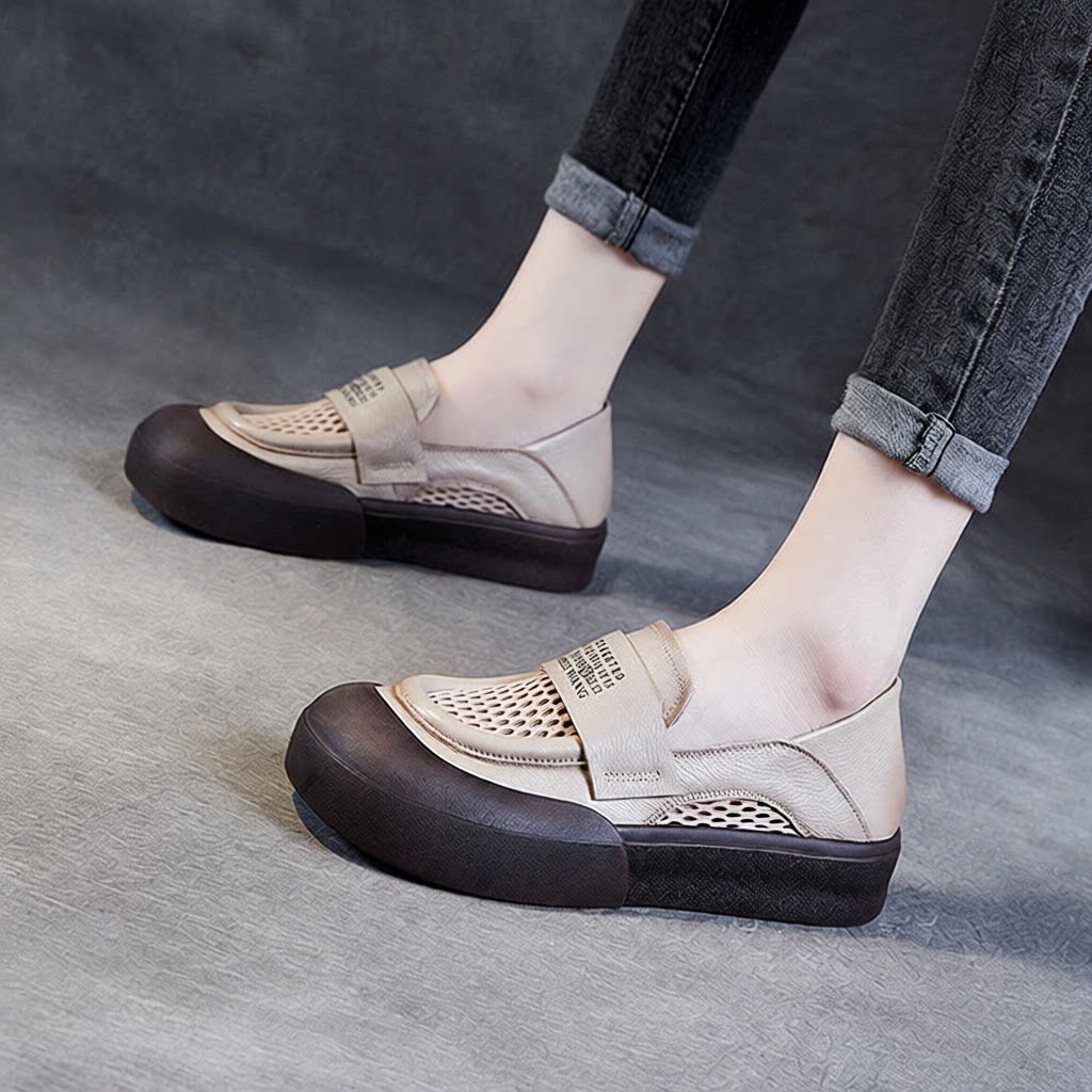 2026春夏新款一脚蹬休闲女鞋真皮软底牛皮透气网面乐福鞋休闲单鞋