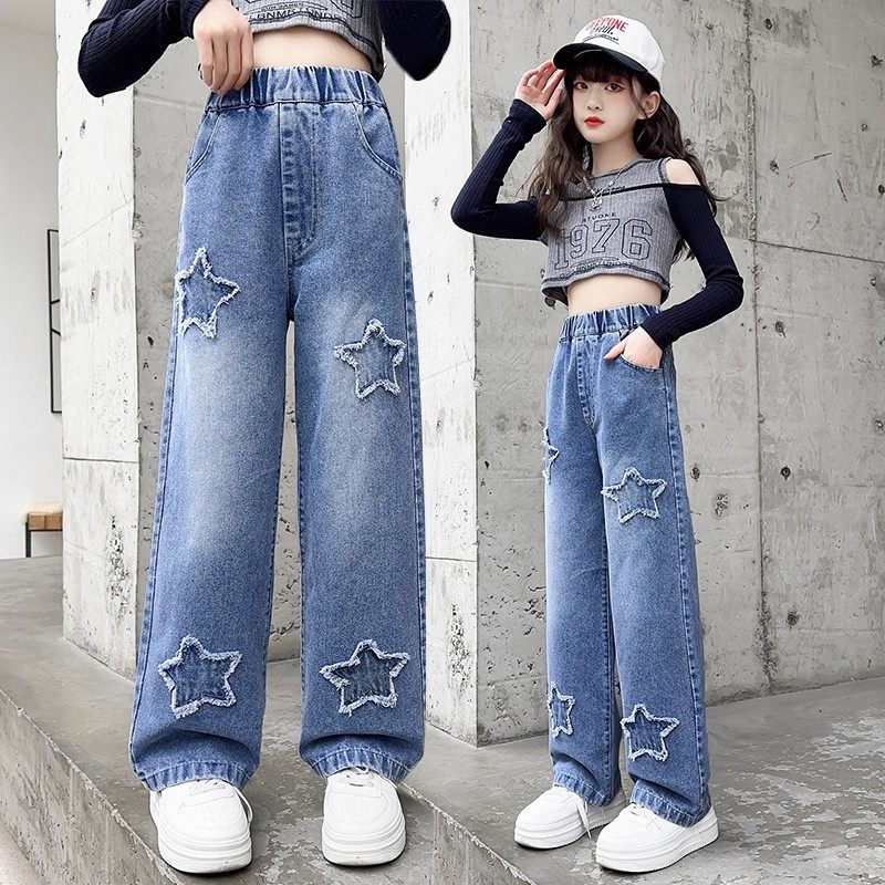 童装女童牛仔裤春秋款星星长裤中腰阔腿裤中大童休闲直筒裤子女孩