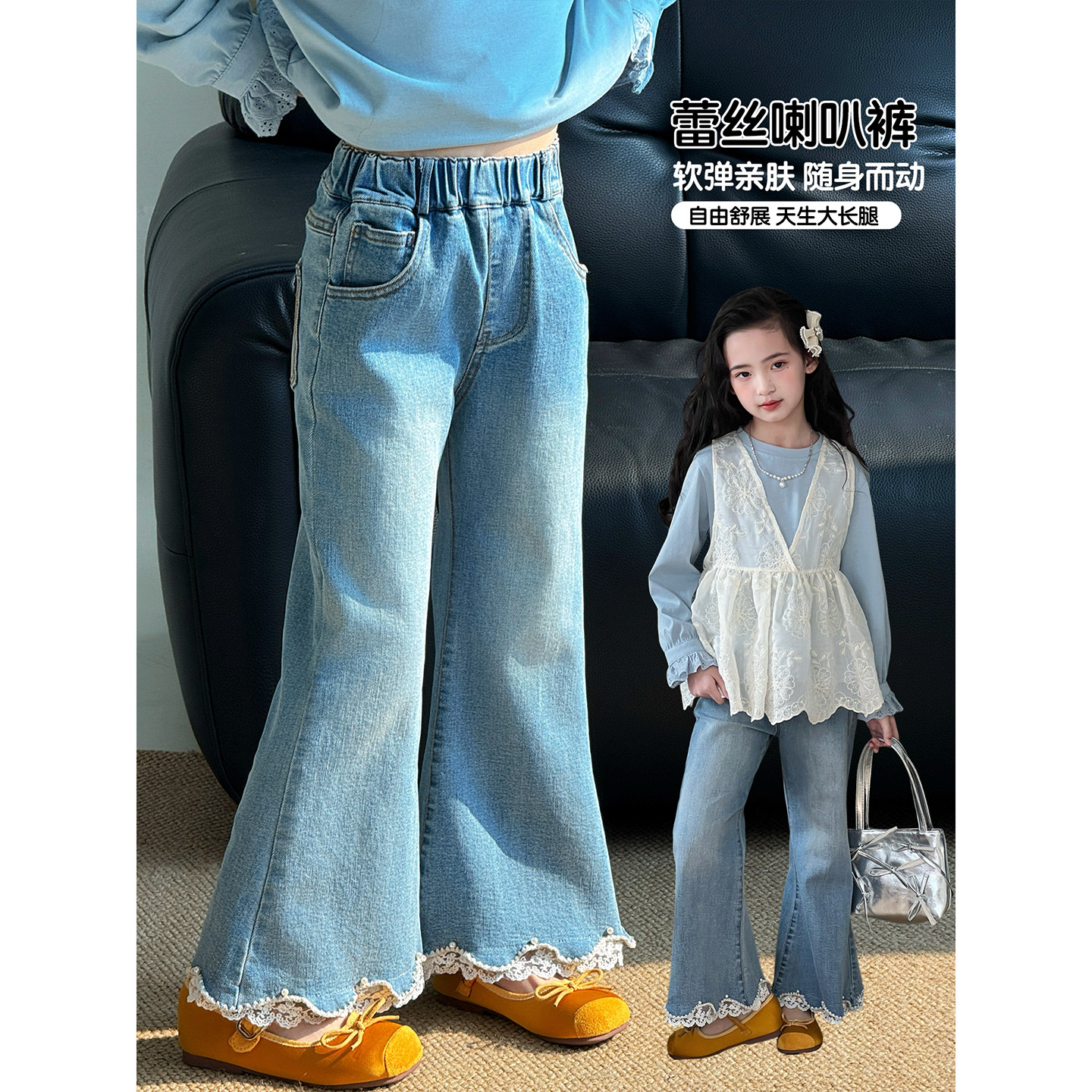 儿童花边直筒裤 水洗软牛仔 女童阔腿裤 中大童长裤 秋款 童装