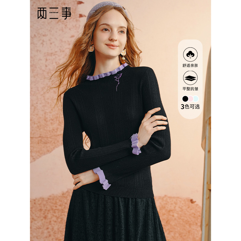 2024年秋冬新款紫色圆领针织衫毛衣女设计感小众荷叶边打底衫上衣