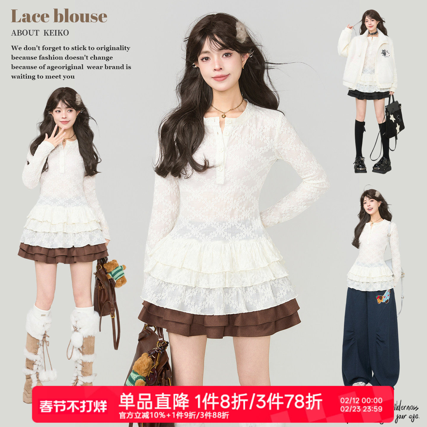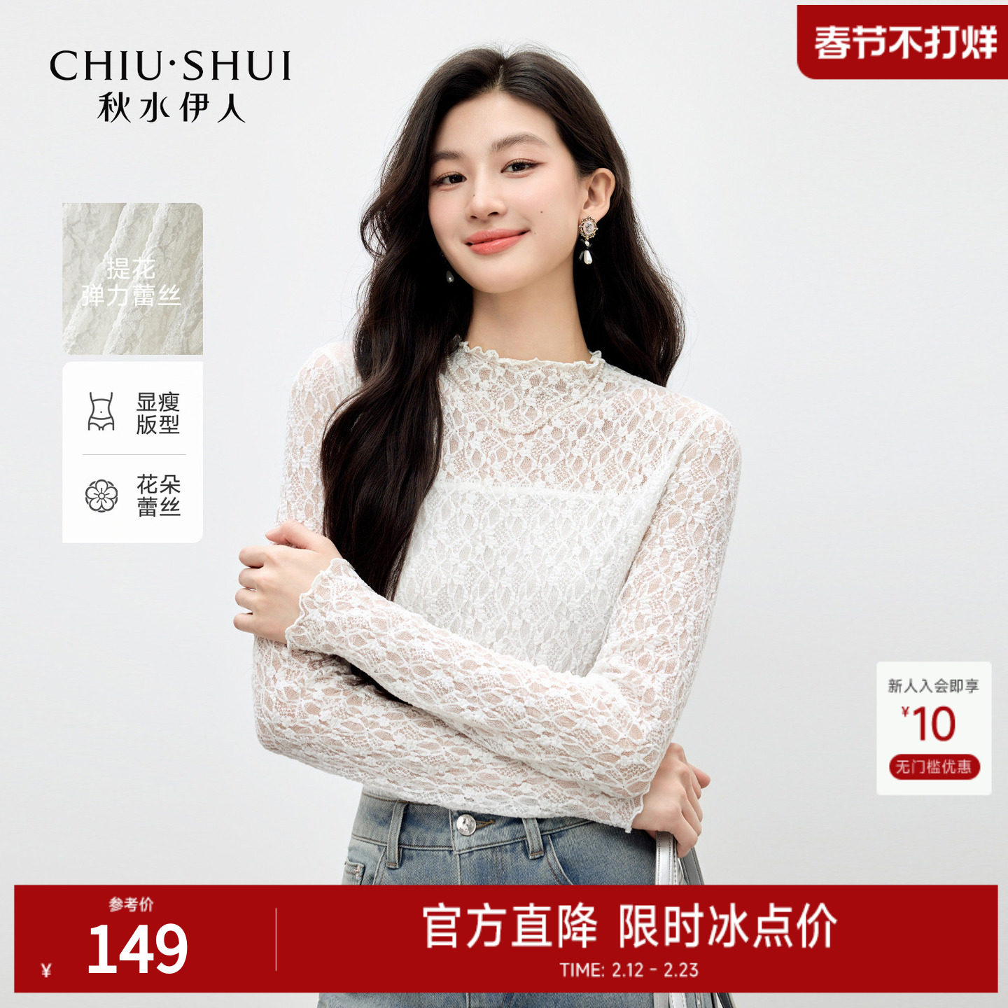 秋水伊人气质荷叶边打底衫2026年春季新款法式温柔风蕾丝镂空上衣