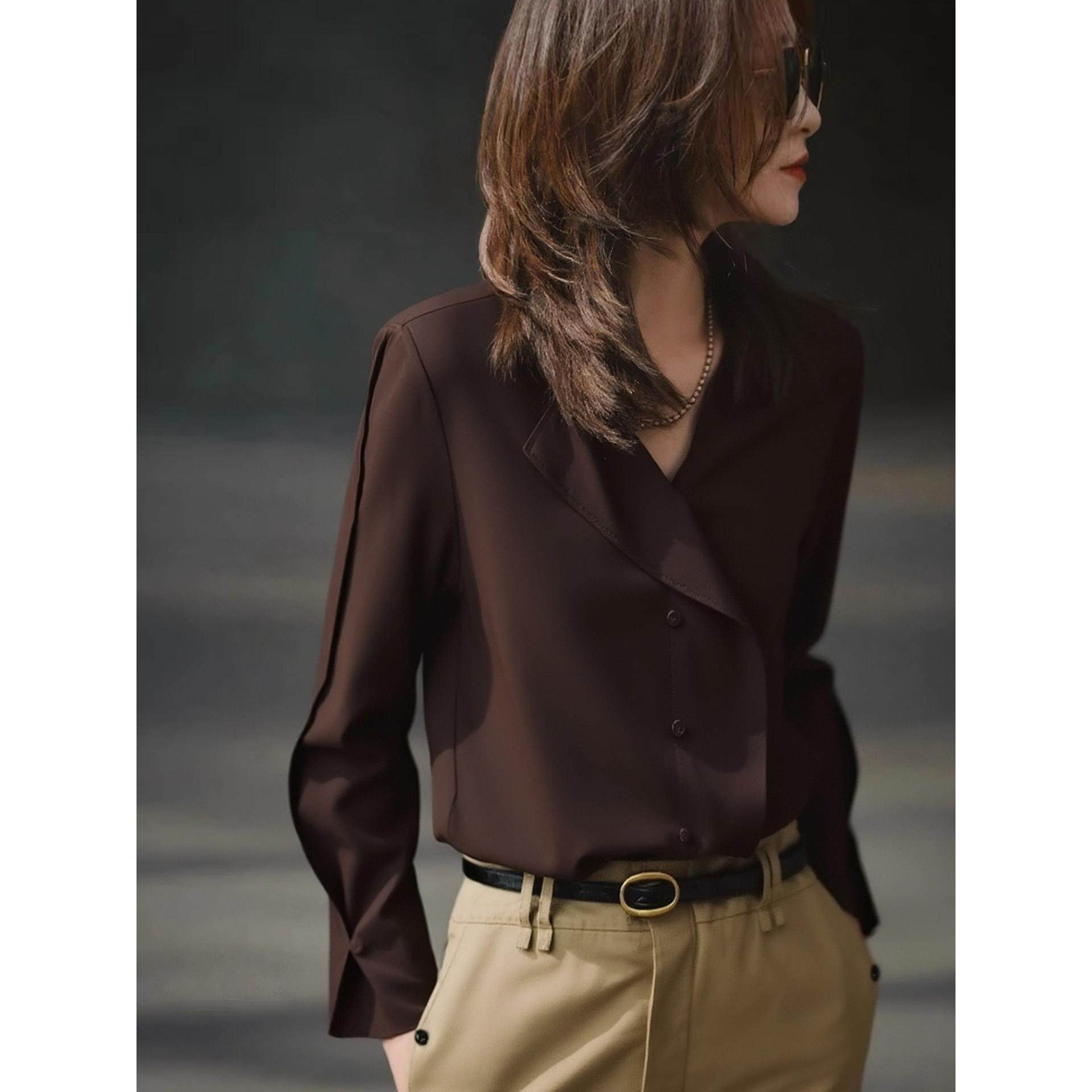 桑蚕丝不对称长袖V领衬衫女春秋新款气质荷叶边打底衬衣真丝上衣