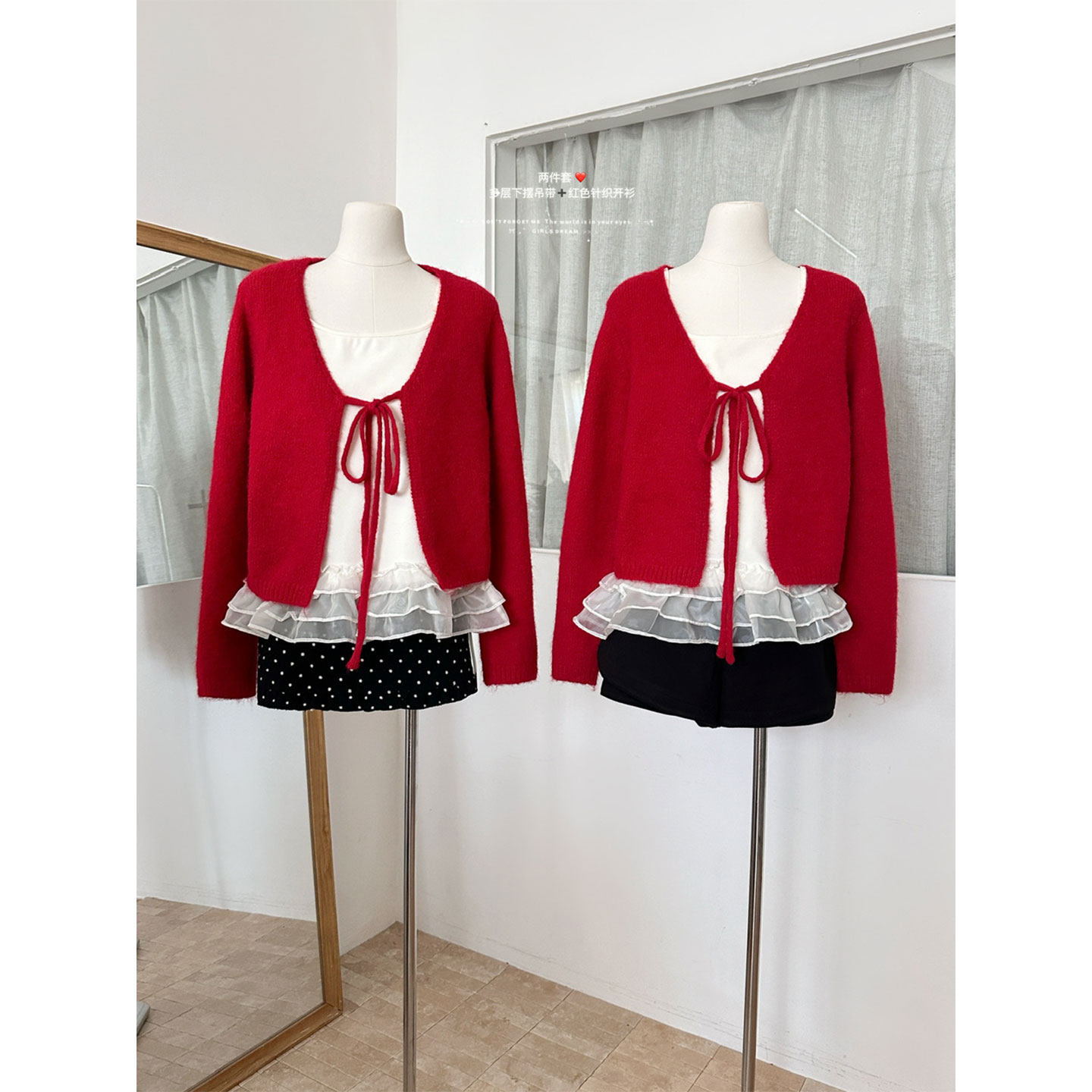 韩系氛围感红色毛衣针织开衫内搭磨毛荷叶边打底吊带春季两件套装