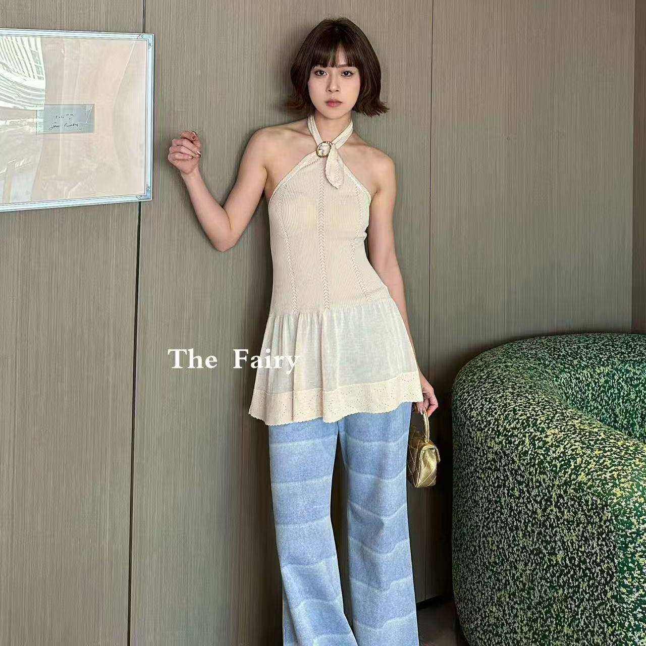 好漂亮针织挂颈金属水钻扣环露背荷叶边打底衫女2026年早春热销