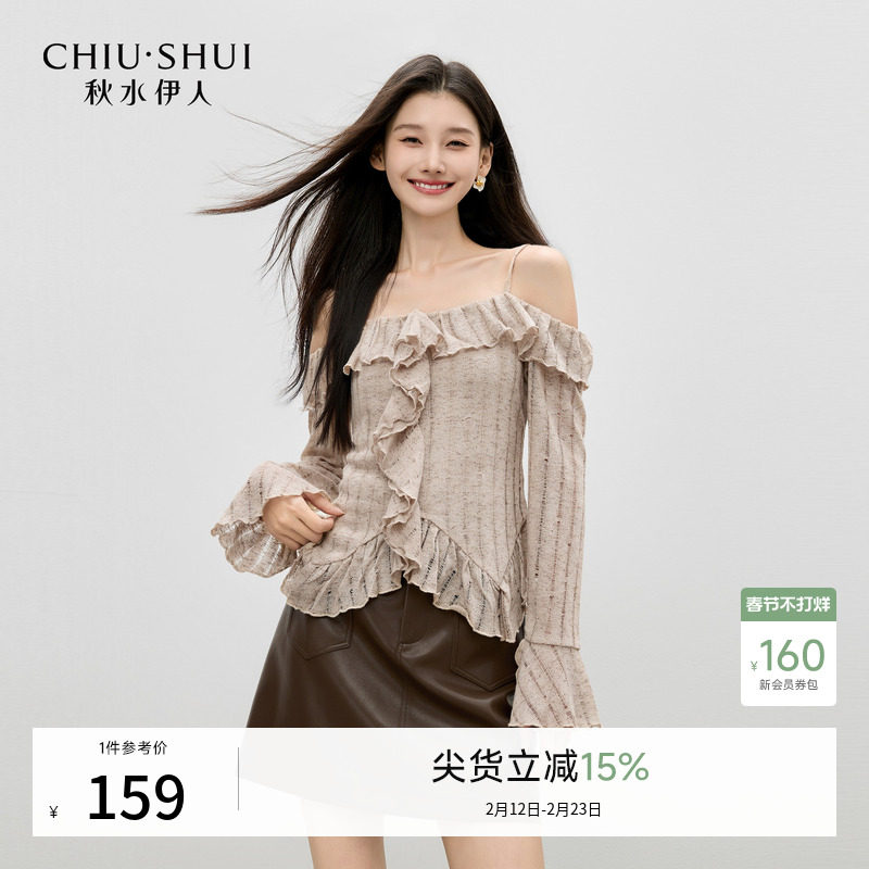 班尼路S&k系列咖色荷叶边长袖t恤女2026秋冬新款内搭打底衫上衣H