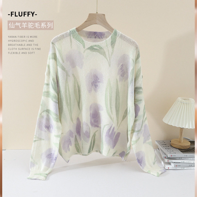 柔绒羊驼毛水彩印染法式风针织衫2025秋季新款羊毛少女毛衣女
