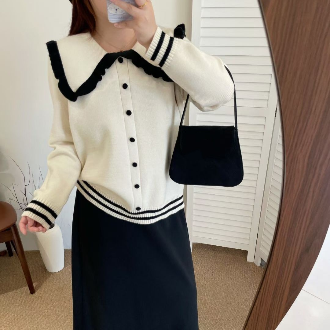 MLS 温柔少女感 撞色圆领短款针织衫女秋季小香风韩系开衫毛衣