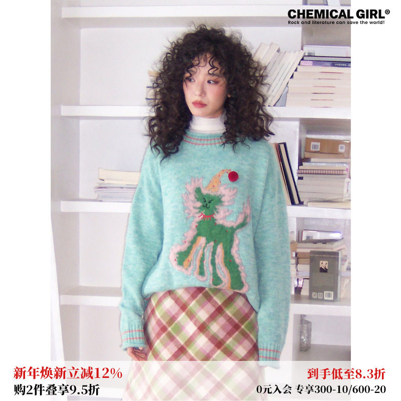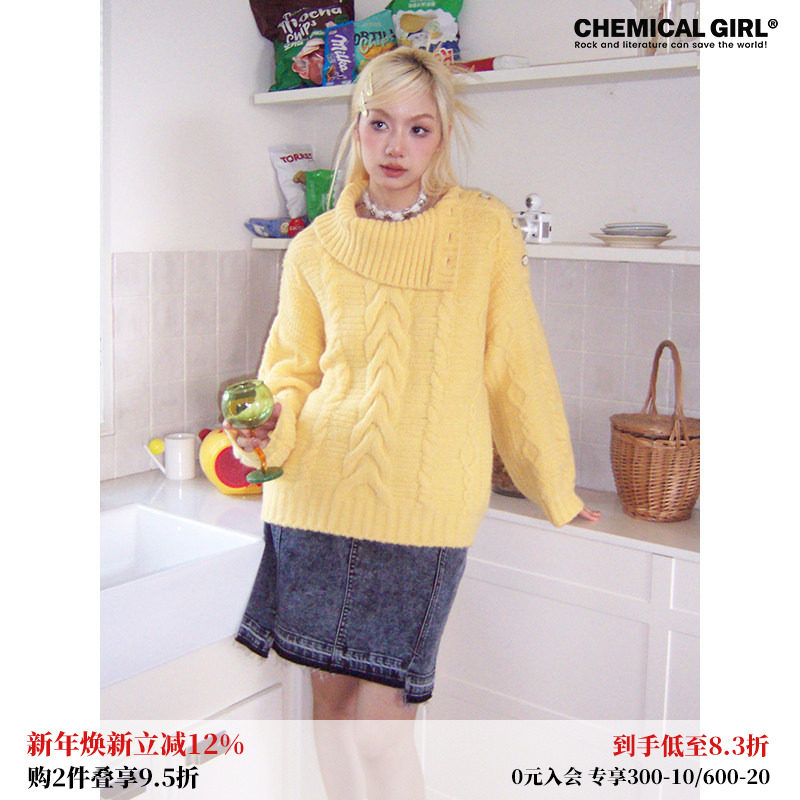 化学少女「奶酪日记」秋冬翻领羊毛马海毛宽松慵懒感毛衣黄色上衣