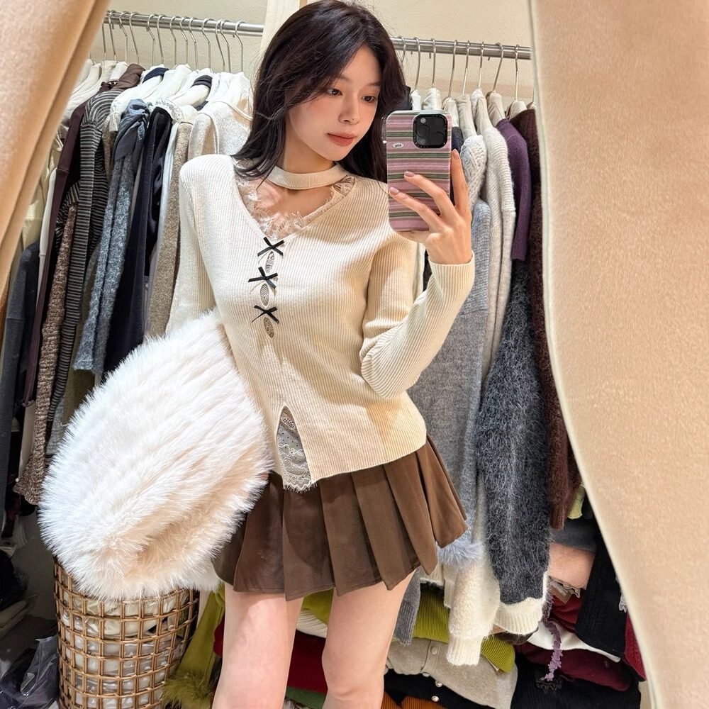 韩式纯欲温柔蕾丝拼接针织衫女冬修身V领挂脖镂空蝴蝶结少女毛衣