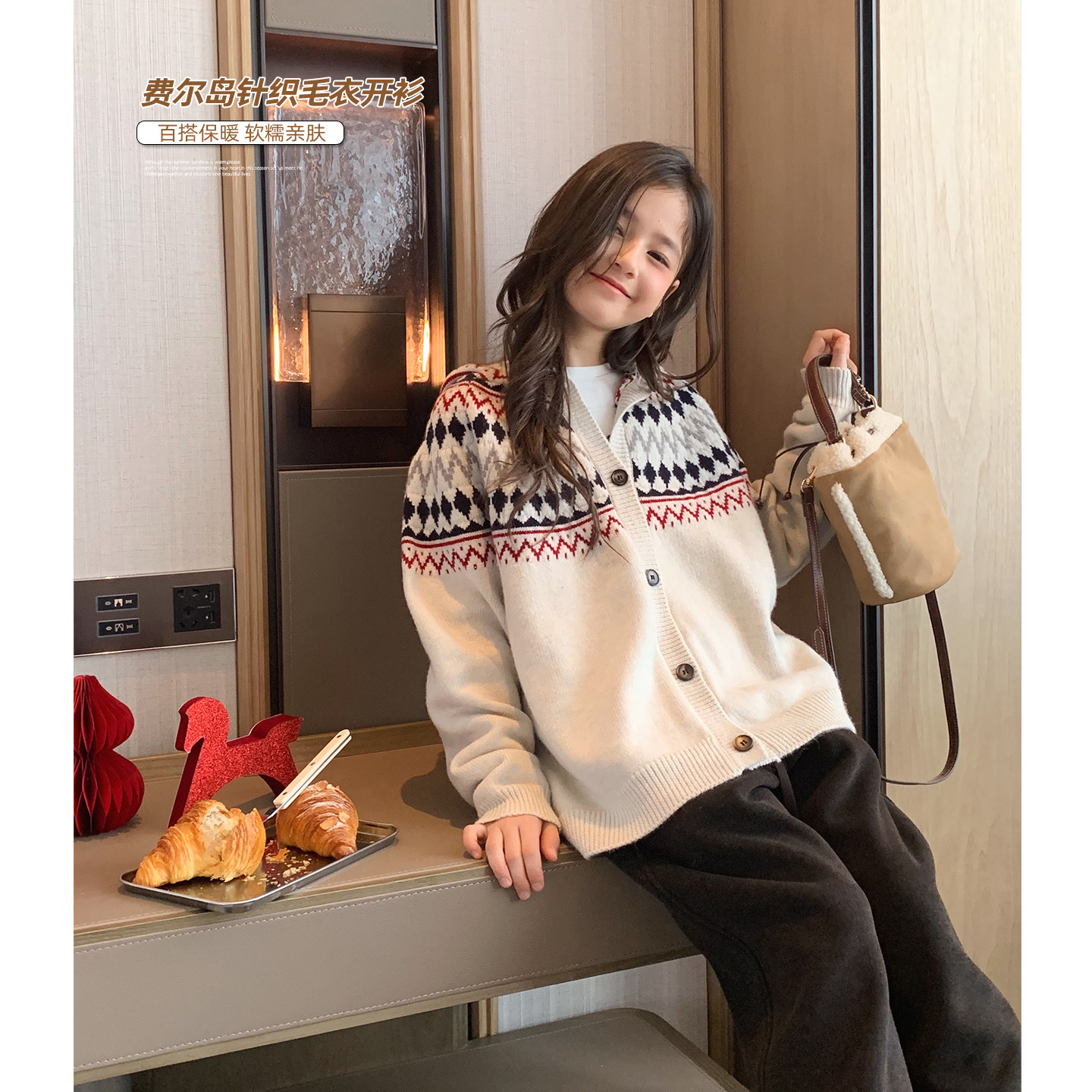 女大童费尔岛连帽开衫2025冬装新款初中生时尚休闲针织衫少女毛衣