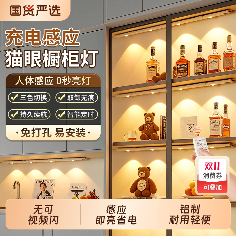 遥控LED橱柜灯带免插充电感应灯展示柜衣柜灯条磁吸无线自粘酒柜