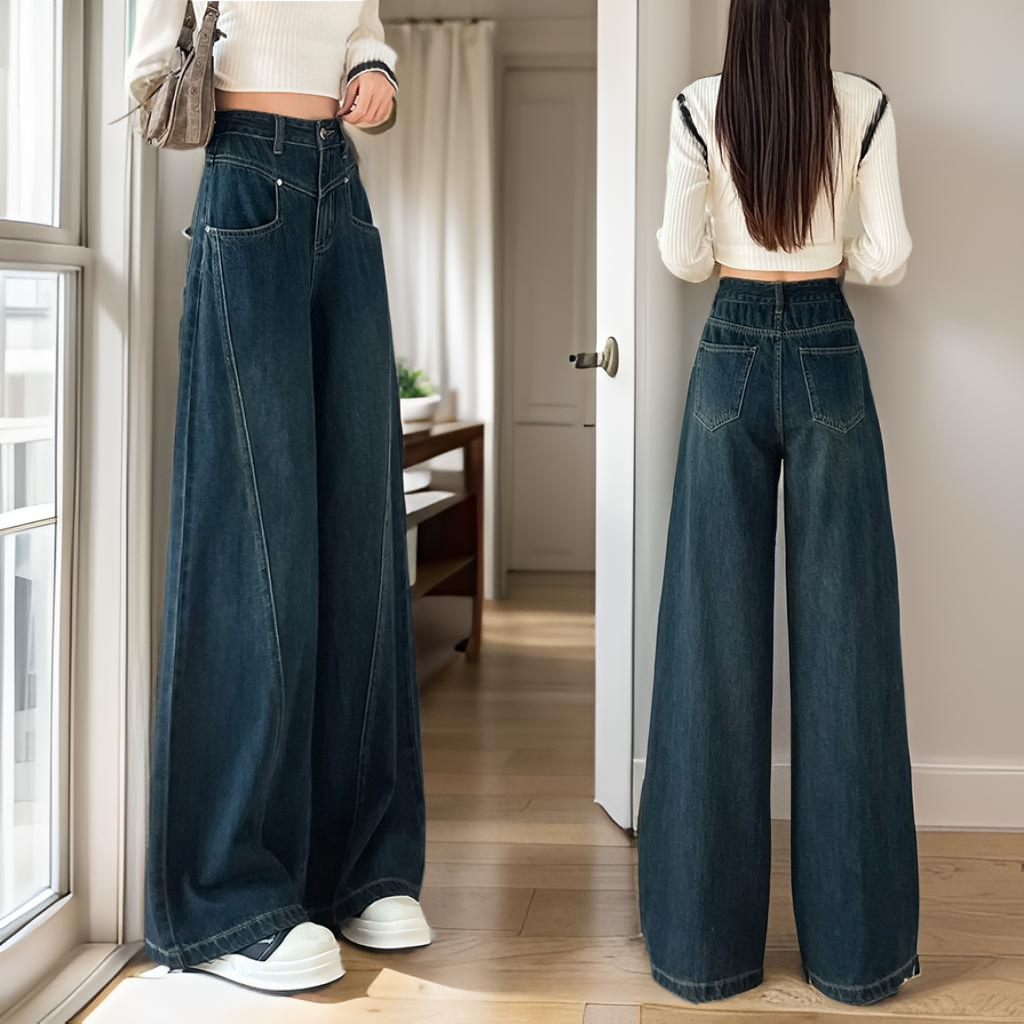 覆古牛仔蓝色宽腿牛仔裤女性2025年新夏季高腰修身大尺寸直腿弯刀