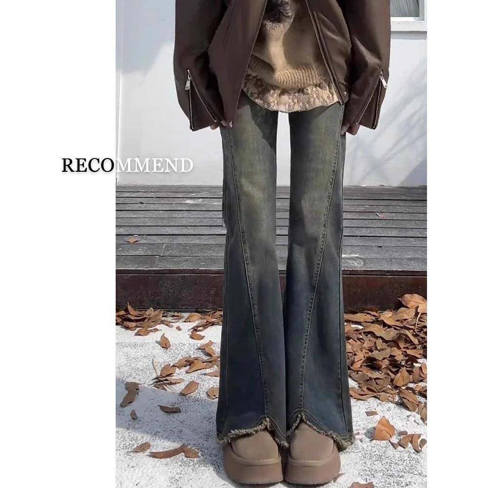 DARLINGAGA美式复古洗水做旧分割感牛仔裤女性感低腰修身微喇长裤