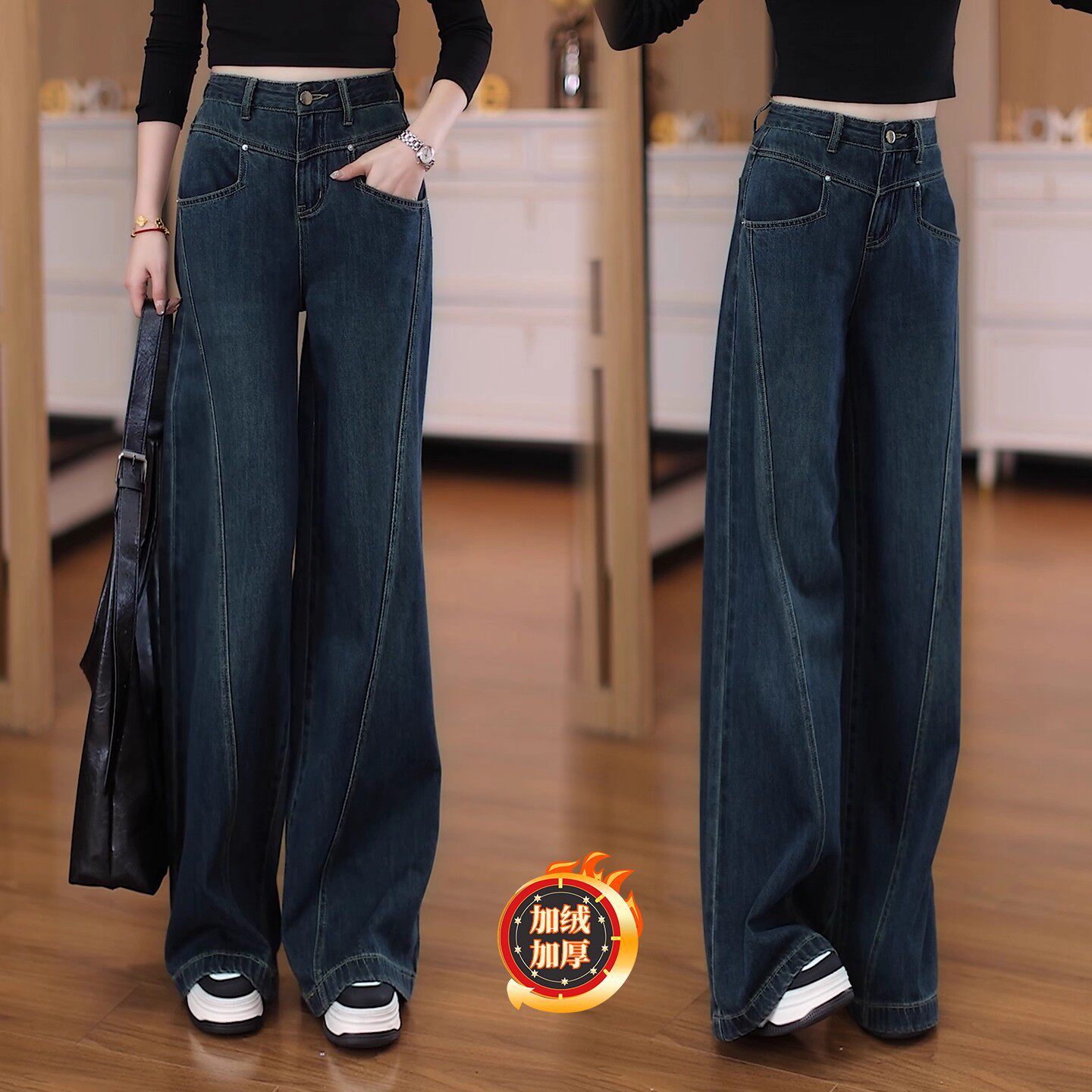 秋冬女性覆古直筒牛仔裤新款羊毛衬里加厚大码梨形修身高腰阔腿裤