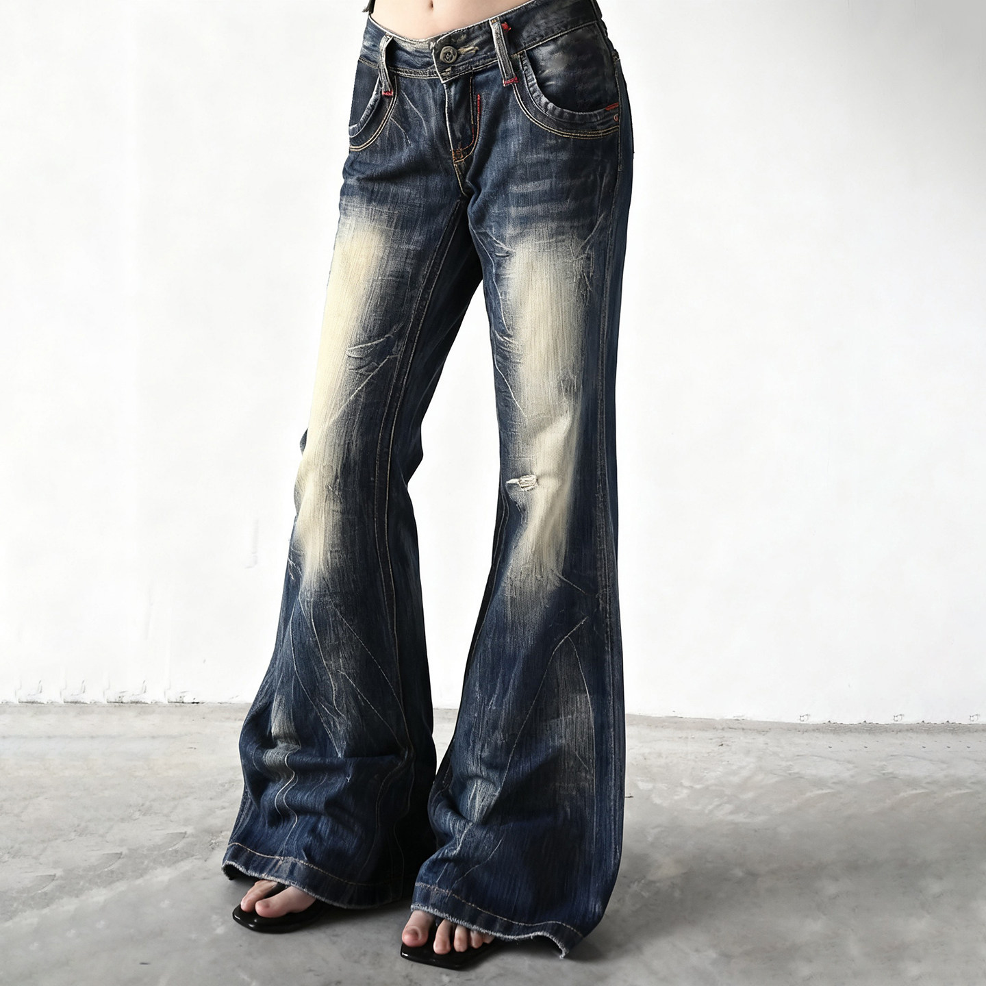千禧辣妹复古低腰修身牛仔长裤女性感露脐显瘦显高紧身提臀喇叭裤