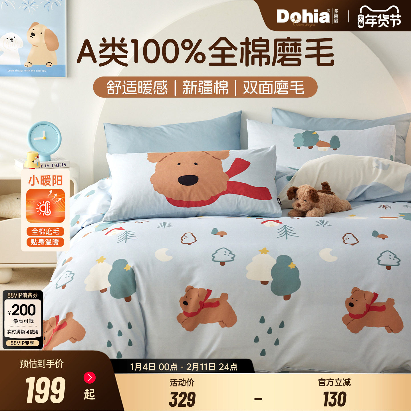 水星儿童家纺全棉A类抗菌卡通印花玉桂狗三/四件套纯棉套件大耳狗