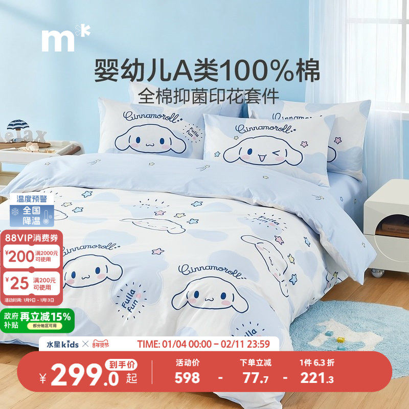 水星家纺母婴A类抑菌三/四件套全棉卡通套件儿童被套床单床笠床品