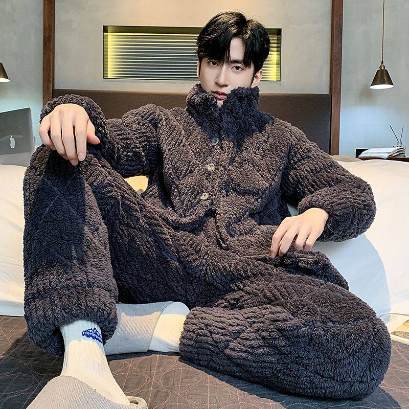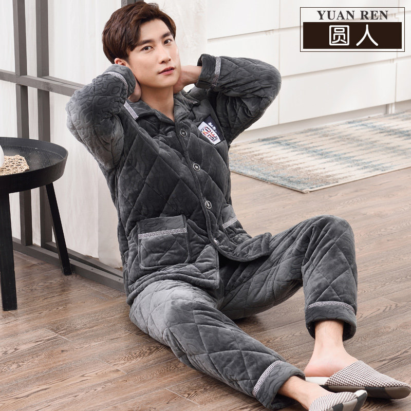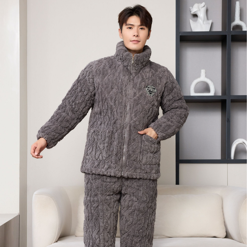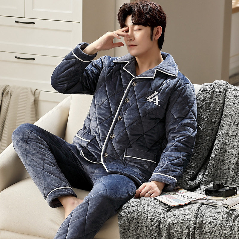 新款男士秋冬季三层夹棉睡衣珊瑚绒加绒加厚法兰绒家居服冬天套装