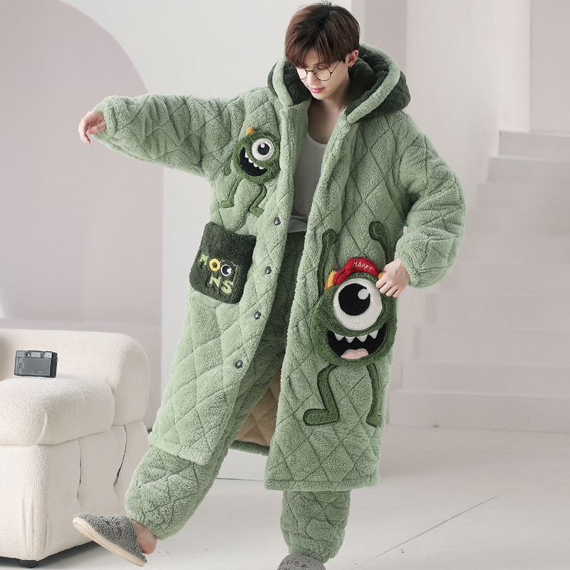 睡衣男冬季加厚加绒三层夹棉保暖珊瑚绒青少年睡袍家居服连帽套装