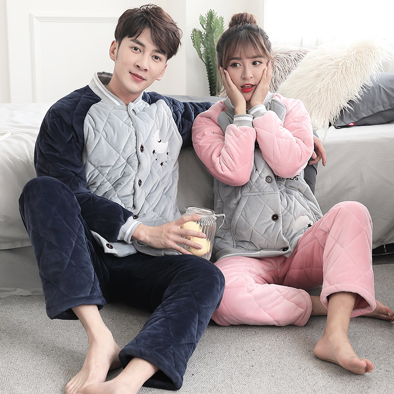 情侣睡衣男冬季加厚加绒家居服女秋冬珊瑚绒三层夹棉加棉保暖套装