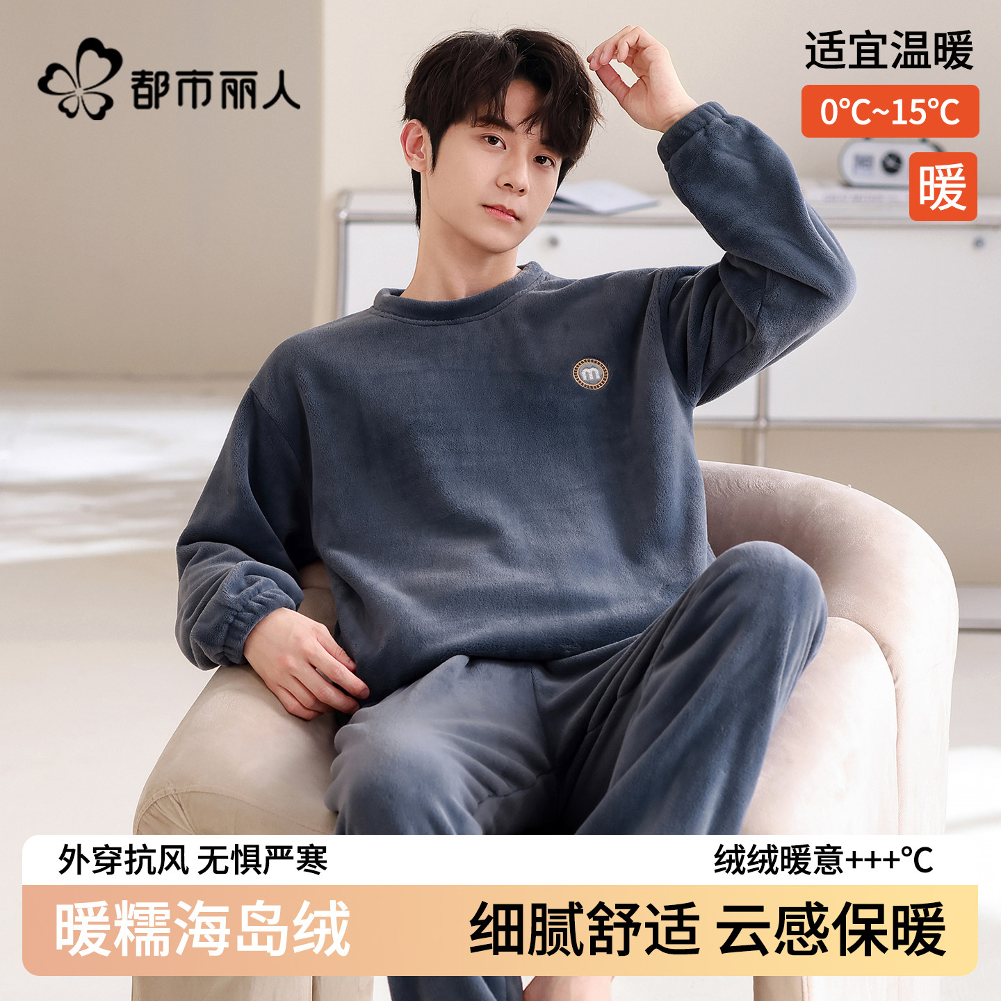 都市丽人睡衣男冬季加厚法兰绒圆领加绒保暖珊瑚绒男士家居服套装
