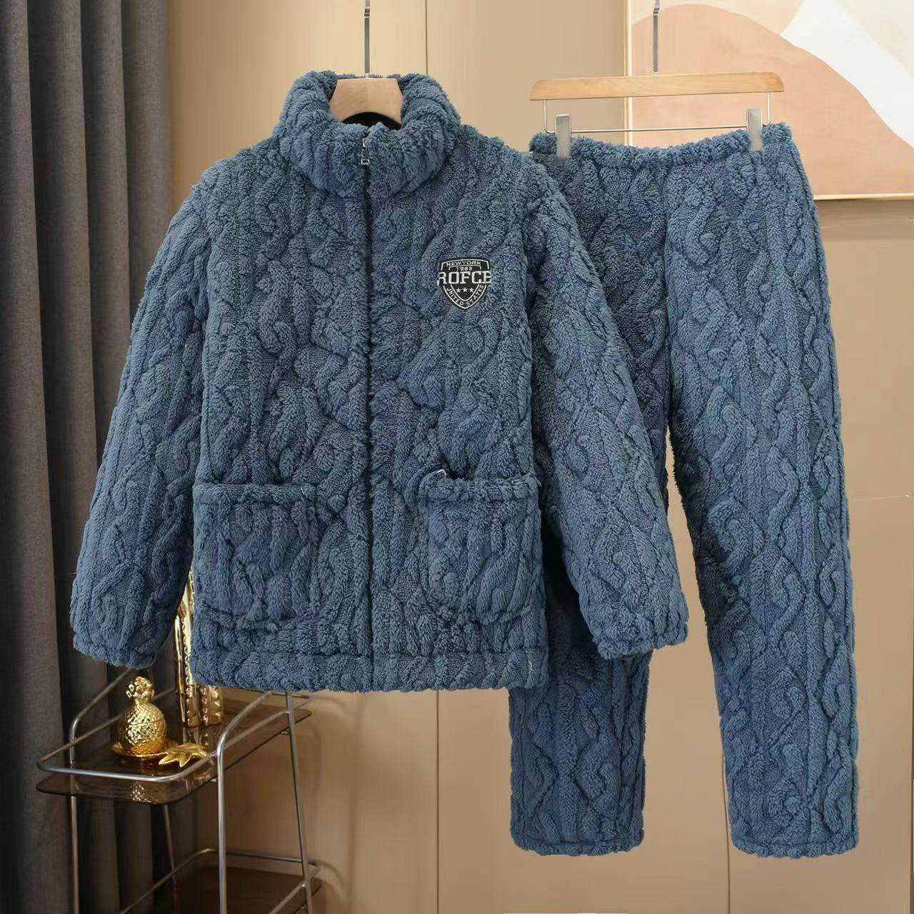 冬季珊瑚绒男士睡衣三层夹棉加厚加绒法兰绒秋冬款家居服保暖套装