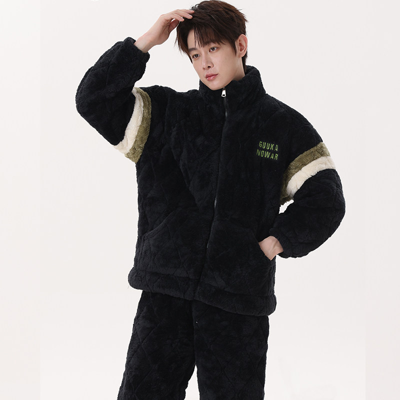 跨境睡衣男冬季加厚加绒保暖珊瑚绒三层夹棉袄新款男士家居服套装