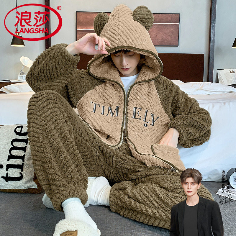 浪莎2025新款睡衣男冬季加厚加绒珊瑚绒法兰绒连帽款家居服套装