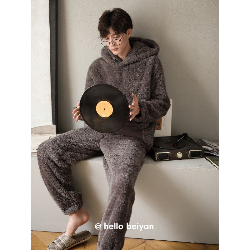 贝妍睡衣男冬季加厚珊瑚绒时尚连帽保暖法兰绒青年大码家居服套装