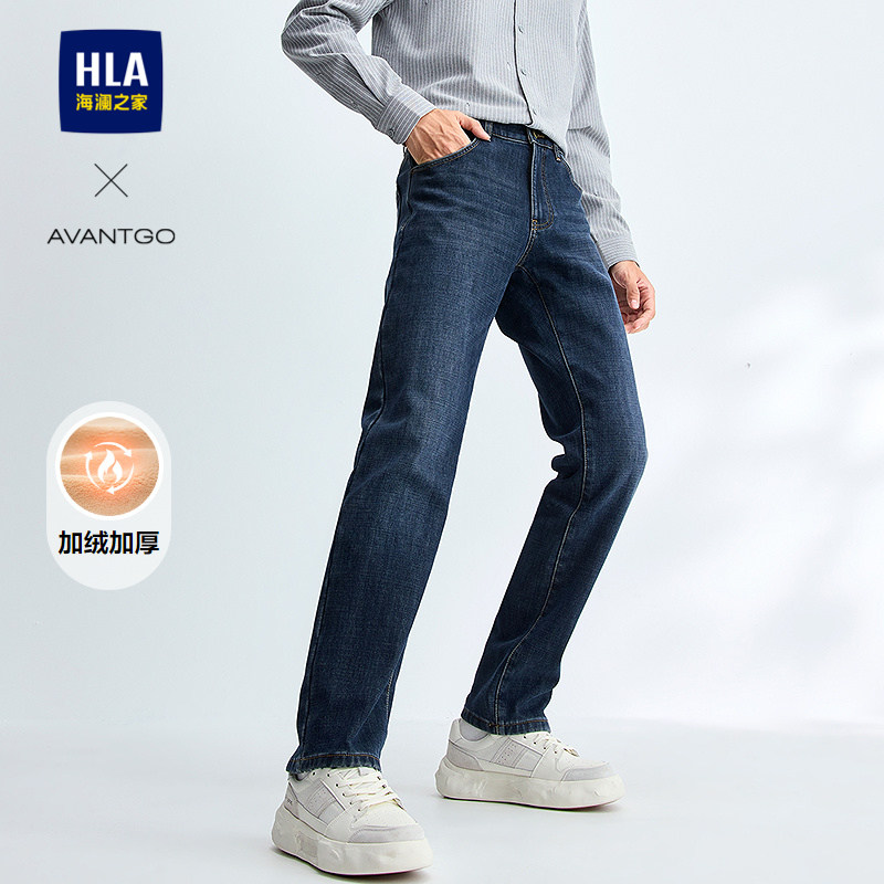 HLA/海澜之家轻商务加绒加厚牛仔裤秋冬季新款保暖直筒长裤子男士