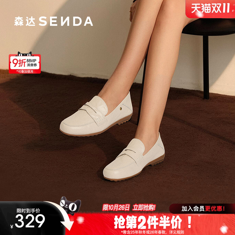 森达白色乐福鞋女鞋新款商场同款牛皮舒适通勤皮鞋平底鞋黑色单鞋