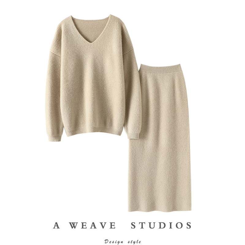 启超温柔岁月~加厚!100%纯山羊绒衫女V领毛衣半身裙休闲羊绒套装