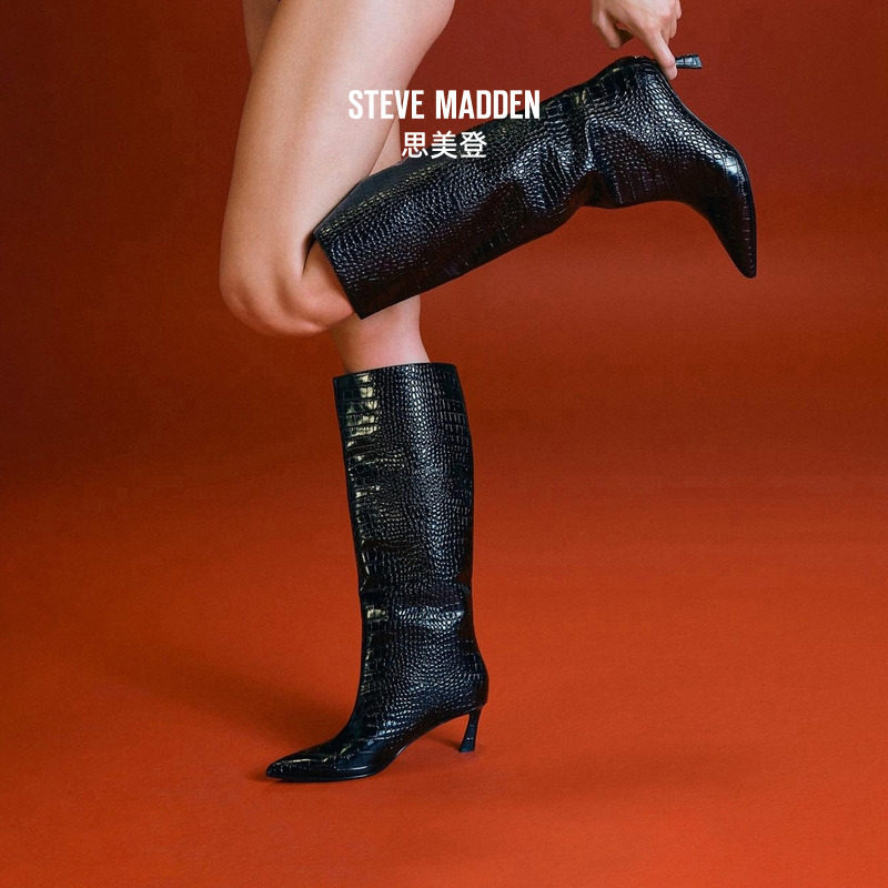 Steve Madden 女鞋LAVAN尖头高跟仿鳄鱼皮纹理长筒靴子高筒靴