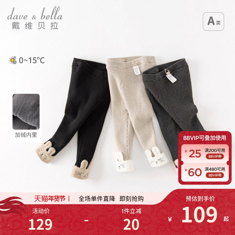 戴维贝拉儿童裤子冬装女童加绒裤女宝宝打底裤外穿长裤童装女小童