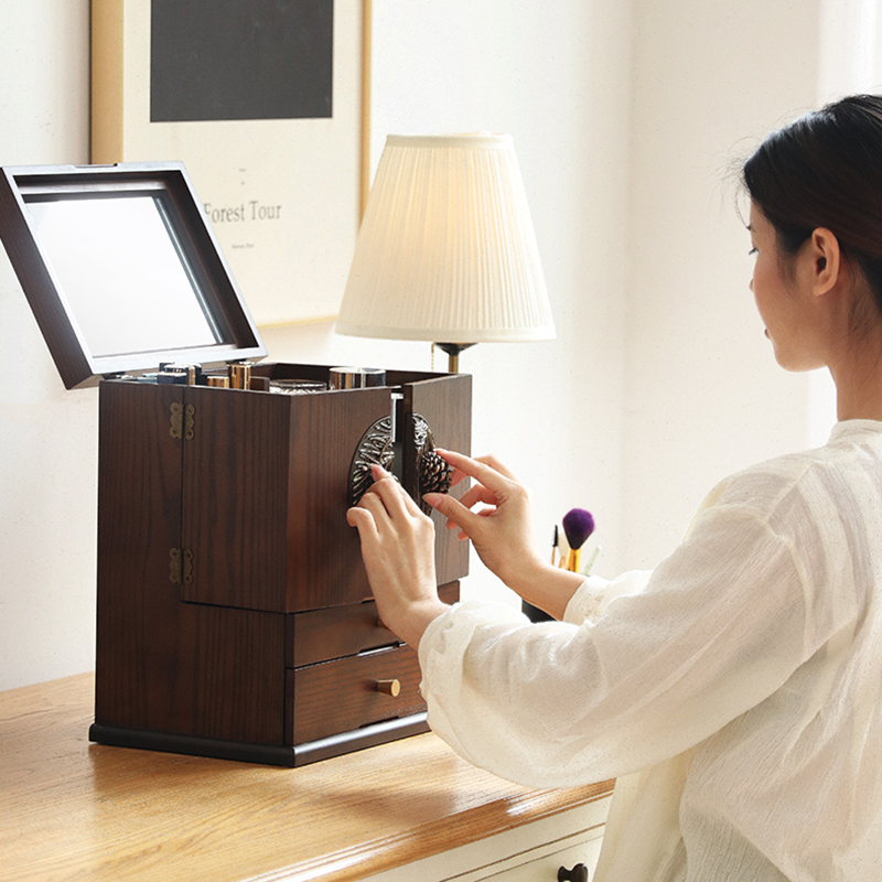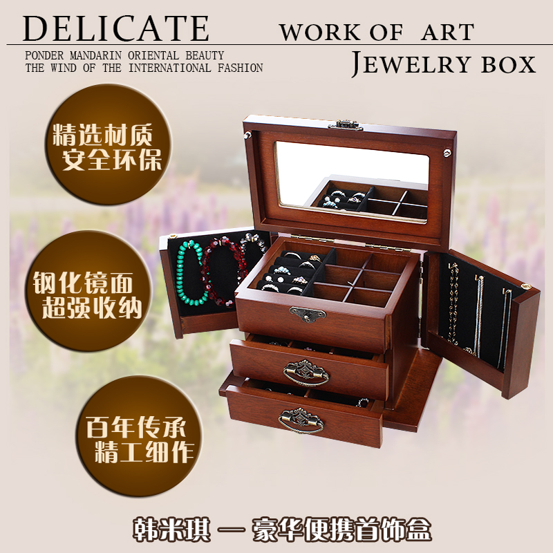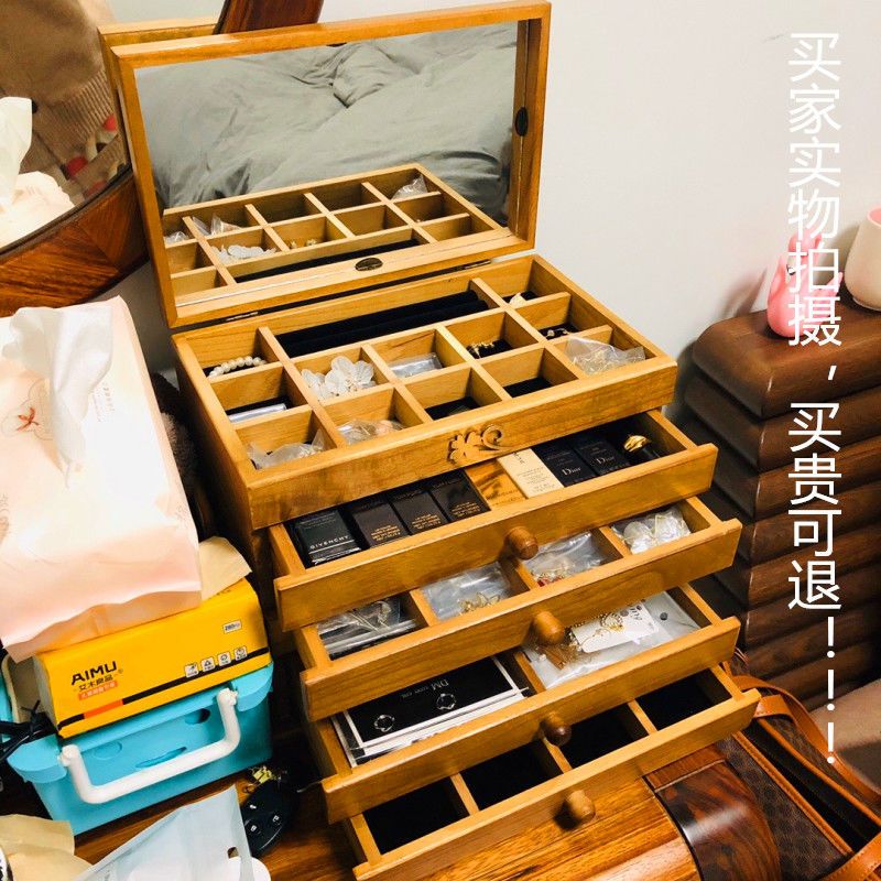 欧式实木多层首饰盒带镜子高档口红小首饰抽屉式绒布防尘收纳盒子